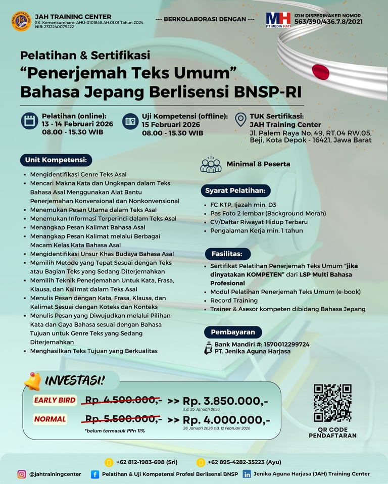 📚✨ Ikuti Pelatihan & Sertifikasi Profesi skema Penerjemah Teks Umum - Bahasa Jepang berlisensi resmi dari BNSP RI.