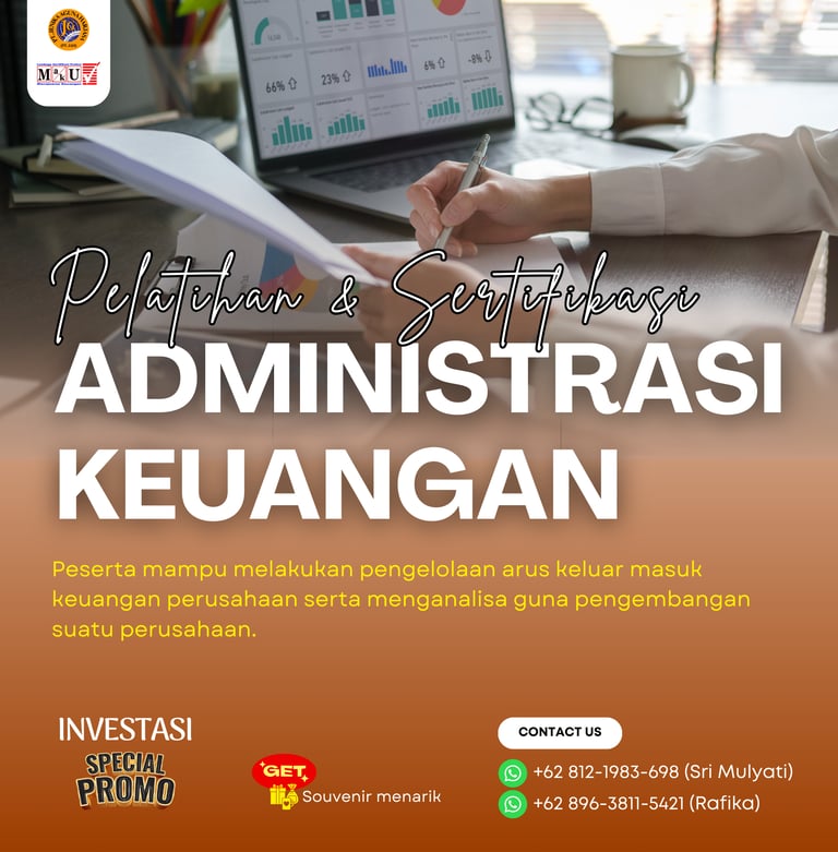 Pelatihan dan Sertifikasi Administrasi Keuangan adalah program pelatihan yang dirancang agar peserta mampu melakukan pengelolaan arus keluar masuk keuangan perusahaan serta menganalisa guna pengembangan suatu perusahaan. Program ini juga memberikan sertifikasi dari Badan Nasional Sertifikasi Profesi (BNSP) sebagai bukti kompetensi peserta dalam skema Administrasi Keuangan.