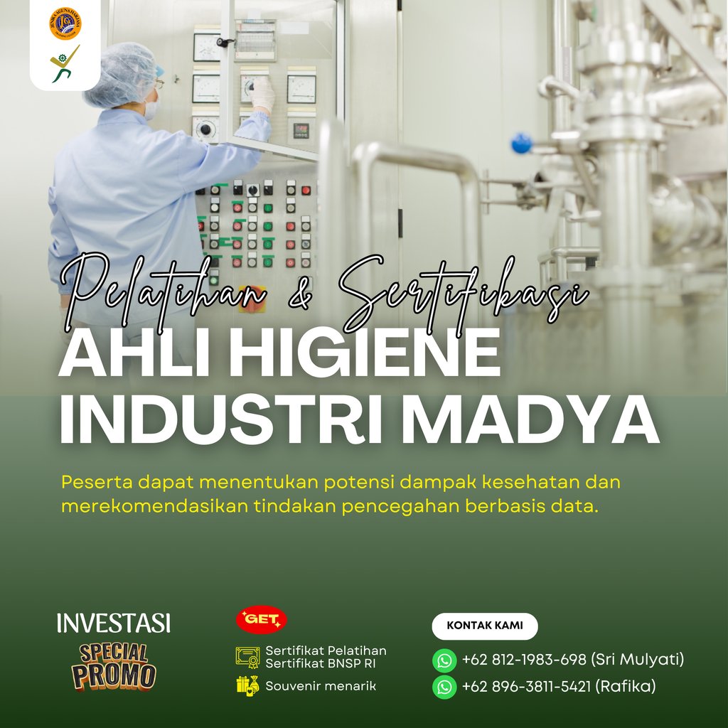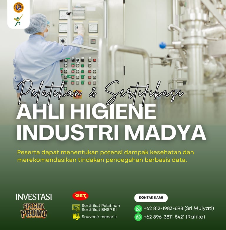 Pelatihan dan Sertifikasi Ahli Higiene Industri Madya adalah program pelatihan yang dirancang untuk membekali tenaga kerja profesional dengan kompetensi lanjutan dalam mengelola, menganalisis, dan mengendalikan faktor bahaya lingkungan kerja yang berpotensi menimbulkan penyakit akibat kerja (PAK), serta mendukung implementasi sistem manajemen K3 secara menyeluruh. Program ini juga memberikan sertifikasi dari Badan Nasional Sertifikasi Profesi (BNSP) sebagai bukti kompetensi peserta dalam skema Ahli Higiene Industri Madya.