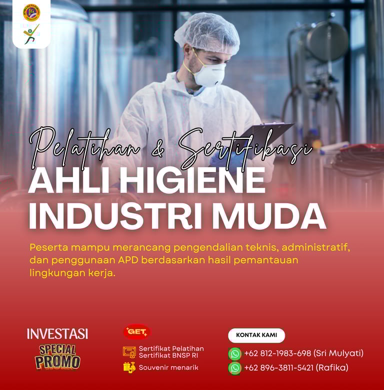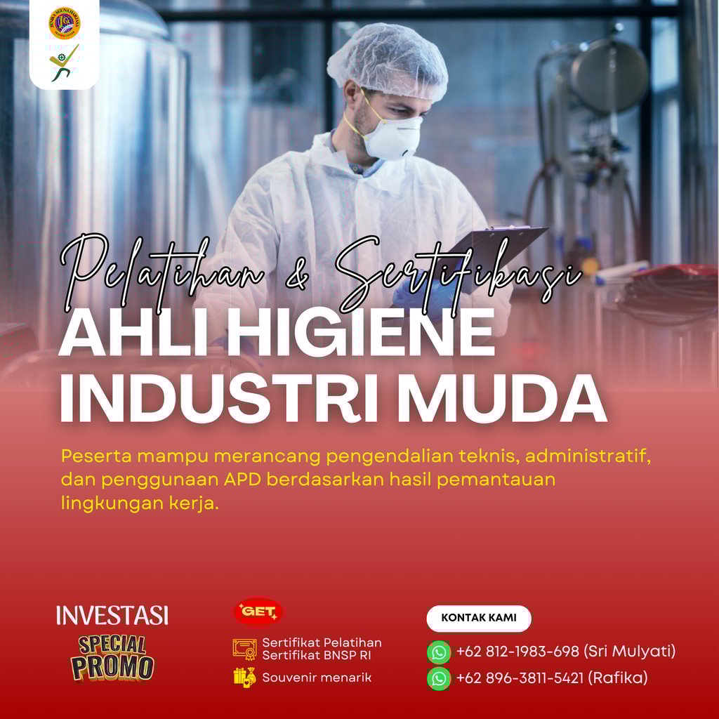 Pelatihan dan Sertifikasi Ahli Higiene Industri Muda adalah program pelatihan yang dirancang untuk membekali peserta dengan kompetensi awal dalam mengidentifikasi, mengevaluasi, dan mengendalikan potensi bahaya di lingkungan kerja yang dapat memengaruhi kesehatan tenaga kerja, khususnya dalam aspek fisik, kimia, biologi, ergonomi, dan psikososial. Program ini juga memberikan sertifikasi dari Badan Nasional Sertifikasi Profesi (BNSP) sebagai bukti kompetensi peserta dalam skema Ahli Higiene Industri Muda.