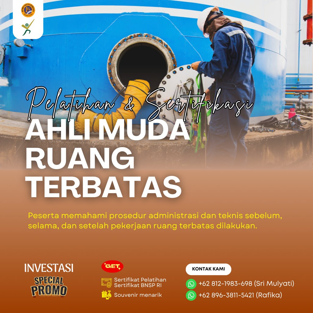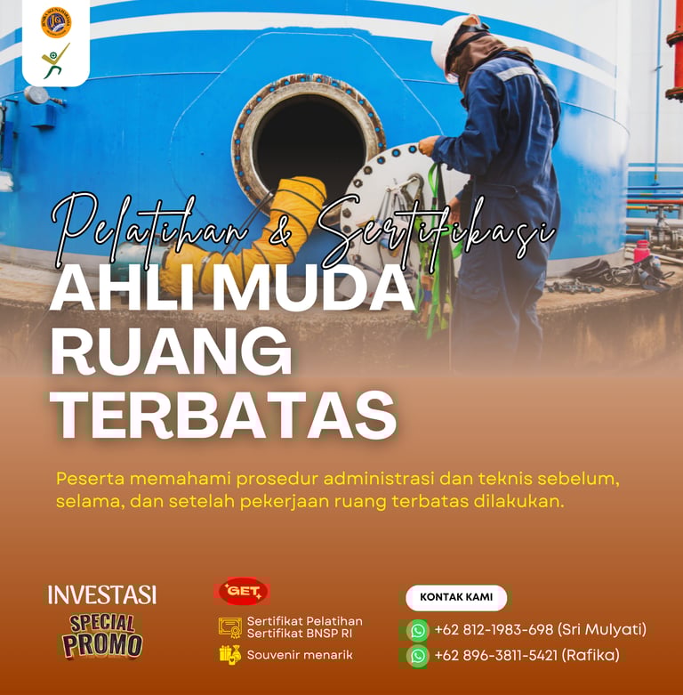 Pelatihan dan Sertifikasi Ahli Muda Ruang Terbatas adalah program pelatihan yang dirancang untuk membekali peserta dengan kompetensi awal dalam merencanakan, mengawasi, dan mengendalikan pekerjaan di ruang terbatas (confined space) secara aman dan sesuai prosedur, guna mencegah kecelakaan kerja dan melindungi keselamatan tenaga kerja. Program ini juga memberikan sertifikasi dari Badan Nasional Sertifikasi Profesi (BNSP) sebagai bukti kompetensi peserta dalam skema Ahli Muda Ruang Terbatas.
