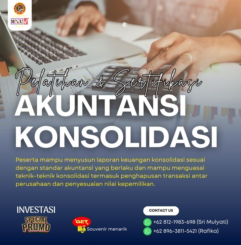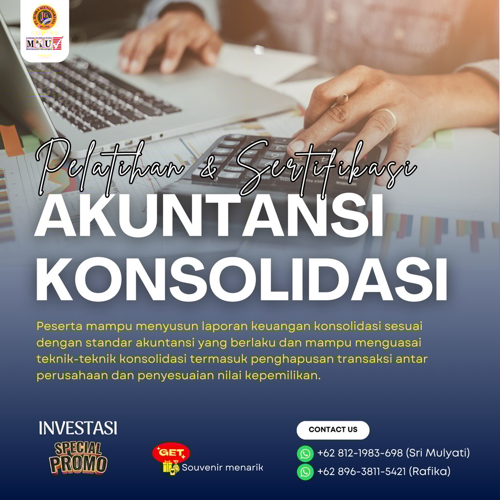 Pelatihan dan Sertifikasi Akuntansi Konsolidasi adalah program pelatihan yang dirancang agar peserta mampu menyusun laporan keuangan konsolidasi sesuai dengan standar akuntansi yang berlaku dan mampu menguasai teknik-teknik konsolidasi termasuk penghapusan transaksi antar perusahaan dan penyesuaian nilai kepemilikan. Program ini juga memberikan sertifikasi dari Badan Nasional Sertifikasi Profesi (BNSP) sebagai bukti kompetensi peserta dalam skema Akuntansi Konsolidasi.