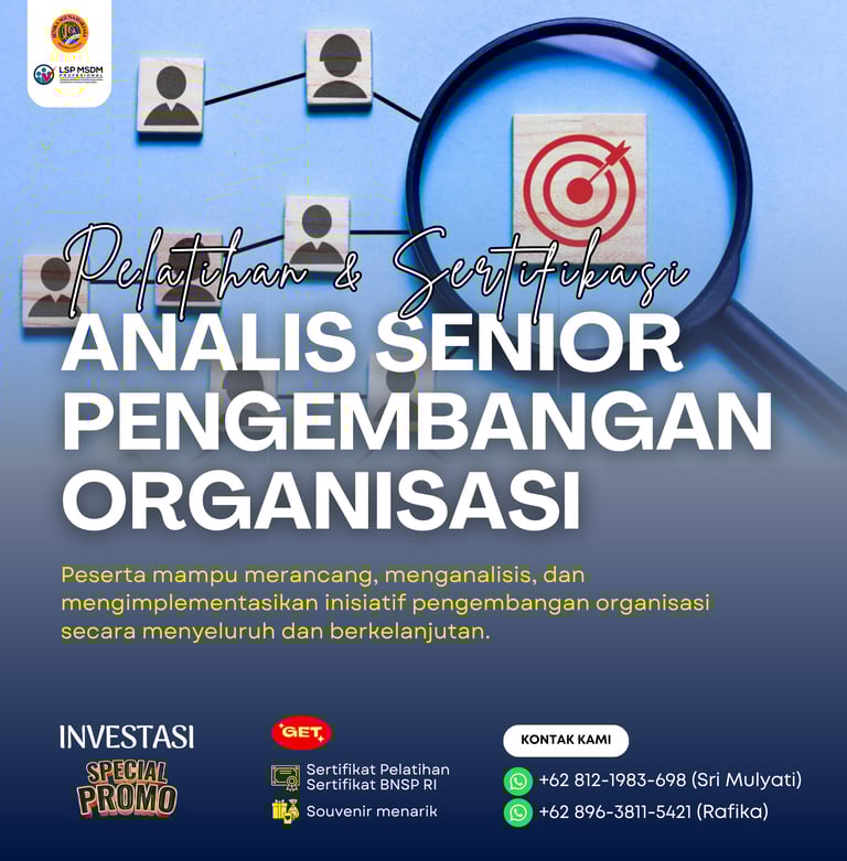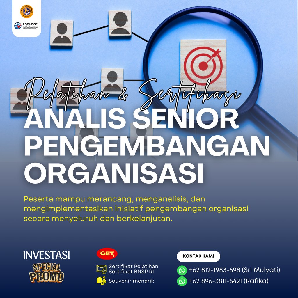 Pelatihan dan Sertifikasi Analis Senior Pengembangan Organisasi adalah program pelatihan yang dirancang untuk membekali peserta dengan kompetensi strategis dalam merancang, mengembangkan, mengimplementasikan, dan mengevaluasi intervensi organisasi yang bertujuan meningkatkan efektivitas, kinerja, serta daya saing organisasi secara berkelanjutan. Program ini juga memberikan sertifikasi dari Badan Nasional Sertifikasi Profesi (BNSP) sebagai bukti kompetensi peserta dalam skema Analis Senior Pengembangan Organisasi.