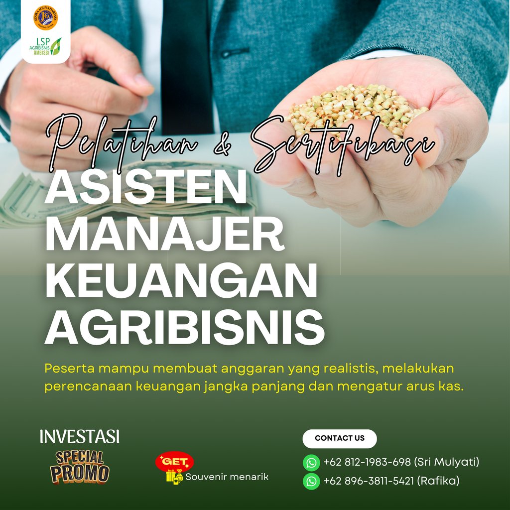 Pelatihan dan Sertifikasi Asisten Manajer Keuangan Agribisnis adalah program pelatihan yang dirancang untuk meningkatkan kualitas dan kuantitas produksi pertanian, serta meningkatkan kemampuan petani dan peternak dalam menghadapi perubahan pasar dan perubahan lingkungan. Program ini juga memberikan sertifikasi dari Badan Nasional Sertifikasi Profesi (BNSP) sebagai bukti kompetensi peserta dalam skema Asisten Manajer Keuangan Agribisnis.