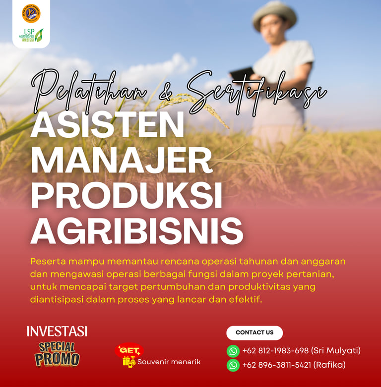 Pelatihan dan Sertifikasi Asisten Manajer Produksi Agribisnis adalah program pelatihan yang dirancang untuk meningkatkan kualitas dan kuantitas produksi pertanian, serta meningkatkan kemampuan petani dan peternak dalam menghadapi perubahan pasar dan perubahan lingkungan. Program ini juga memberikan sertifikasi dari Badan Nasional Sertifikasi Profesi (BNSP) sebagai bukti kompetensi peserta dalam skema Asisten Manajer Produksi Agribisnis.