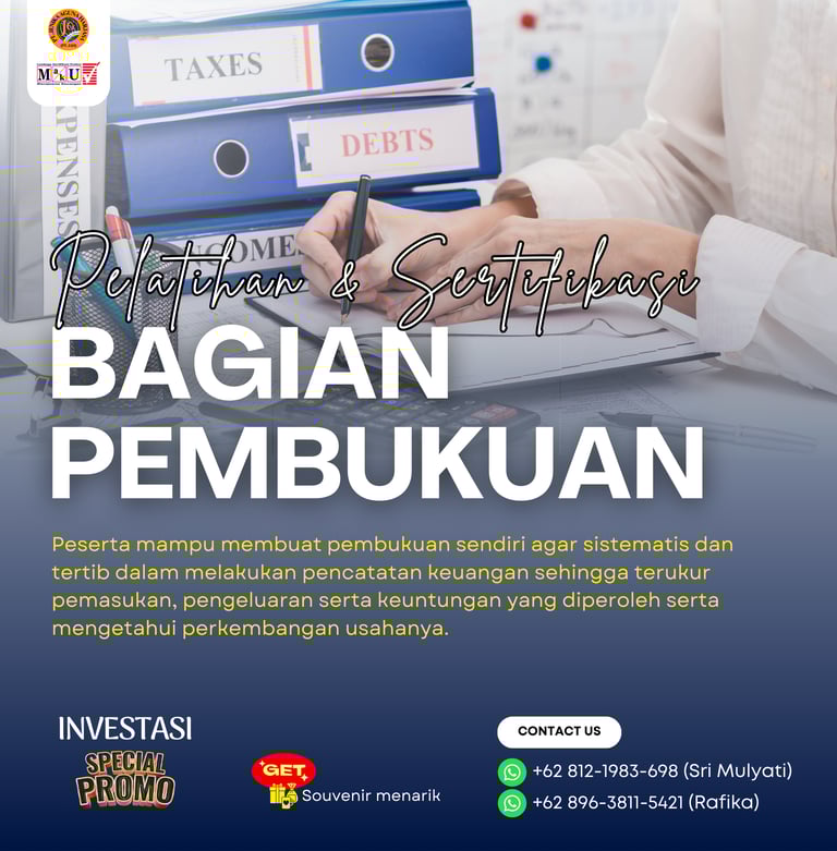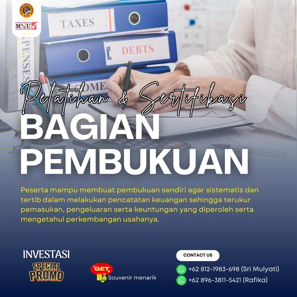 Pelatihan dan Sertifikasi Bagian Pembukuan adalah program pelatihan yang dirancang agar peserta mampu membuat pembukuan sendiri agar sistematis dan tertib dalam melakukan pencatatan keuangan sehingga terukur pemasukan, pengeluaran serta keuntungan yang diperoleh serta mengetahui perkembangan usahanya. Program ini juga memberikan sertifikasi dari Badan Nasional Sertifikasi Profesi (BNSP) sebagai bukti kompetensi peserta dalam skema Bagian Pembukuan.
