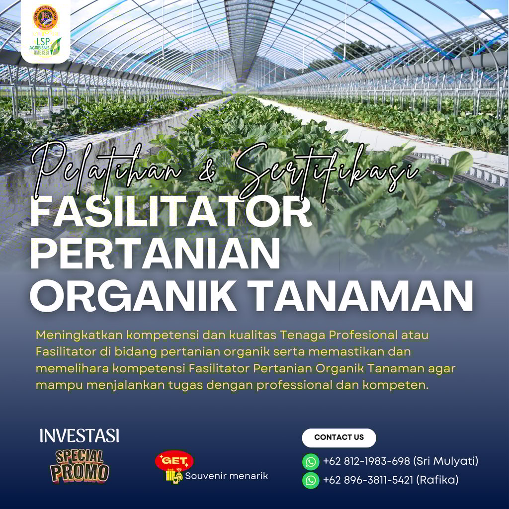 Pelatihan dan Sertifikasi Fasilitator Pertanian Organik Tanaman adalah program pelatihan yang dirancang untuk meningkatkan kompetensi dan kualitas Tenaga Profesional atau Fasilitator di bidang pertanian organik serta memastikan dan memelihara kompetensi Fasilitator Pertanian Organik Tanaman agar mampu menjalankan tugas dengan professional dan kompeten. Program ini juga memberikan sertifikasi dari Badan Nasional Sertifikasi Profesi (BNSP) sebagai bukti kompetensi peserta dalam skema Fasilitator Pertanian Organik Tanaman.