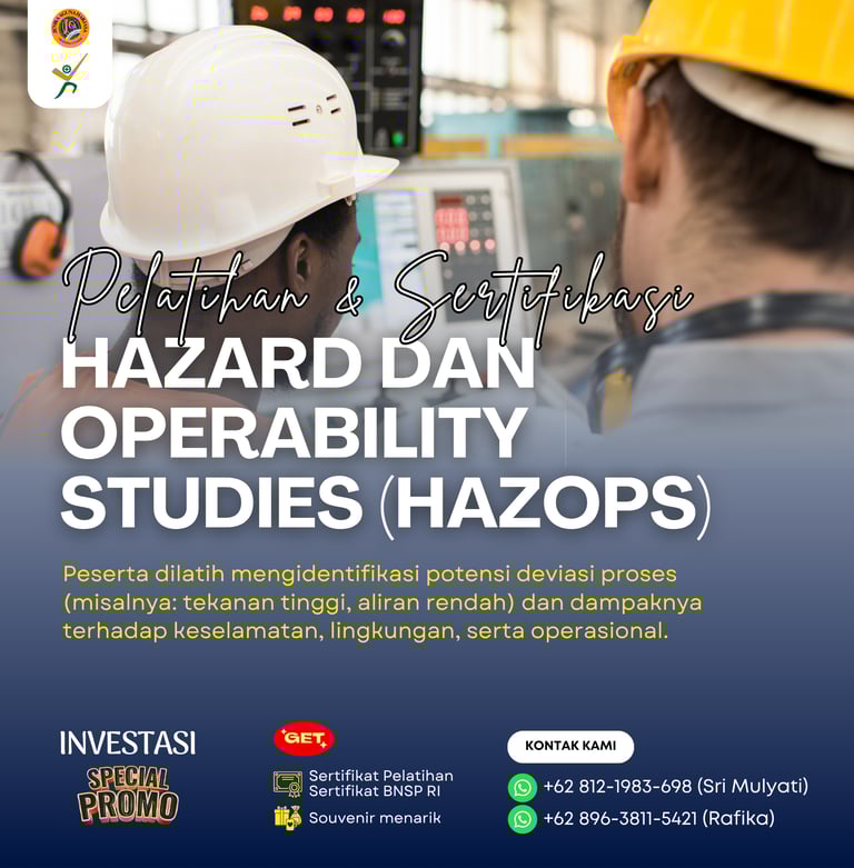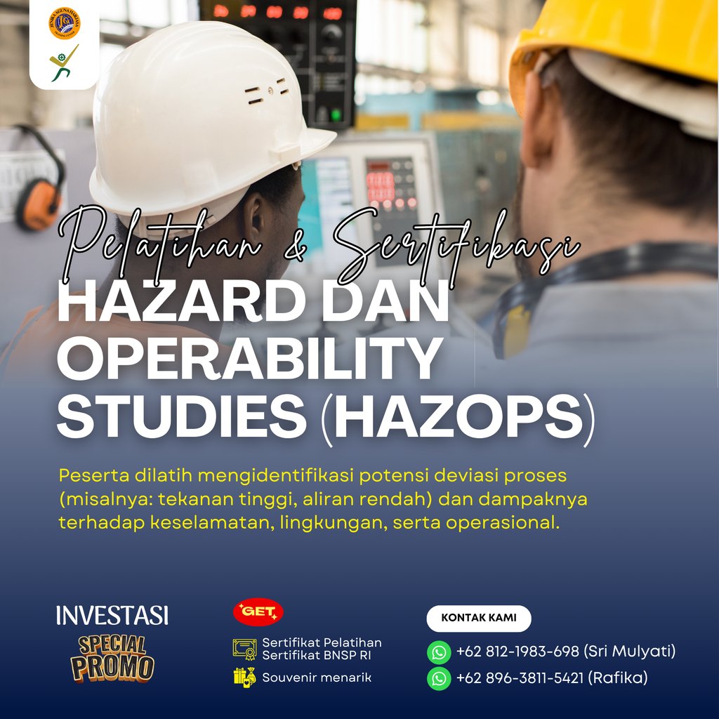 Pelatihan dan Sertifikasi Hazard dan Operability Studies (HAZOPS) adalah program pelatihan yang dirancang untuk membekali peserta dengan kompetensi dalam melakukan identifikasi bahaya dan studi kelayakan operasional secara sistematis terhadap proses, sistem, atau fasilitas industri, terutama di sektor berisiko tinggi seperti migas, kimia, dan manufaktur. Program ini juga memberikan sertifikasi dari Badan Nasional Sertifikasi Profesi (BNSP) sebagai bukti kompetensi peserta dalam skema Hazard dan Operability Studies (HAZOPS).