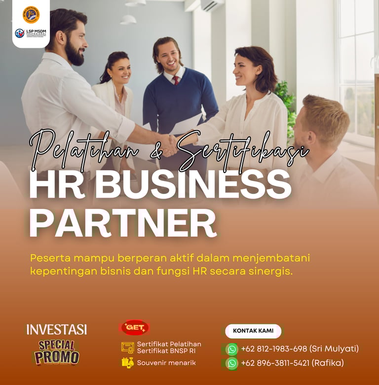 Pelatihan dan Sertifikasi HR Business Partner adalah program pelatihan yang dirancang untuk membekali peserta dengan kompetensi strategis dalam menyelaraskan fungsi SDM dengan tujuan bisnis organisasi, serta berperan sebagai mitra manajemen dalam pengambilan keputusan yang berdampak pada kinerja organisasi. Program ini juga memberikan sertifikasi dari Badan Nasional Sertifikasi Profesi (BNSP) sebagai bukti kompetensi peserta dalam skema HR Business Partner.