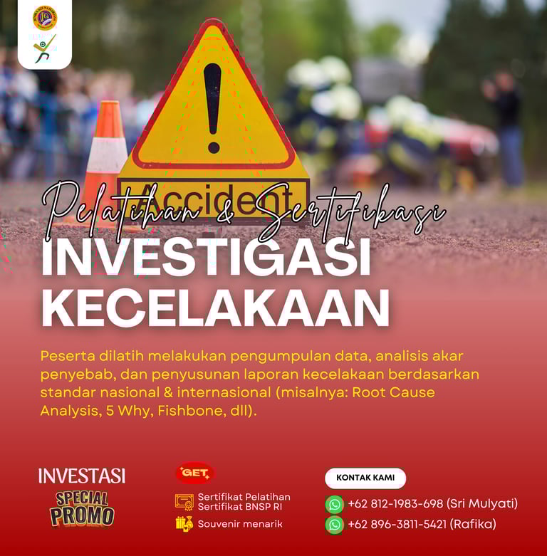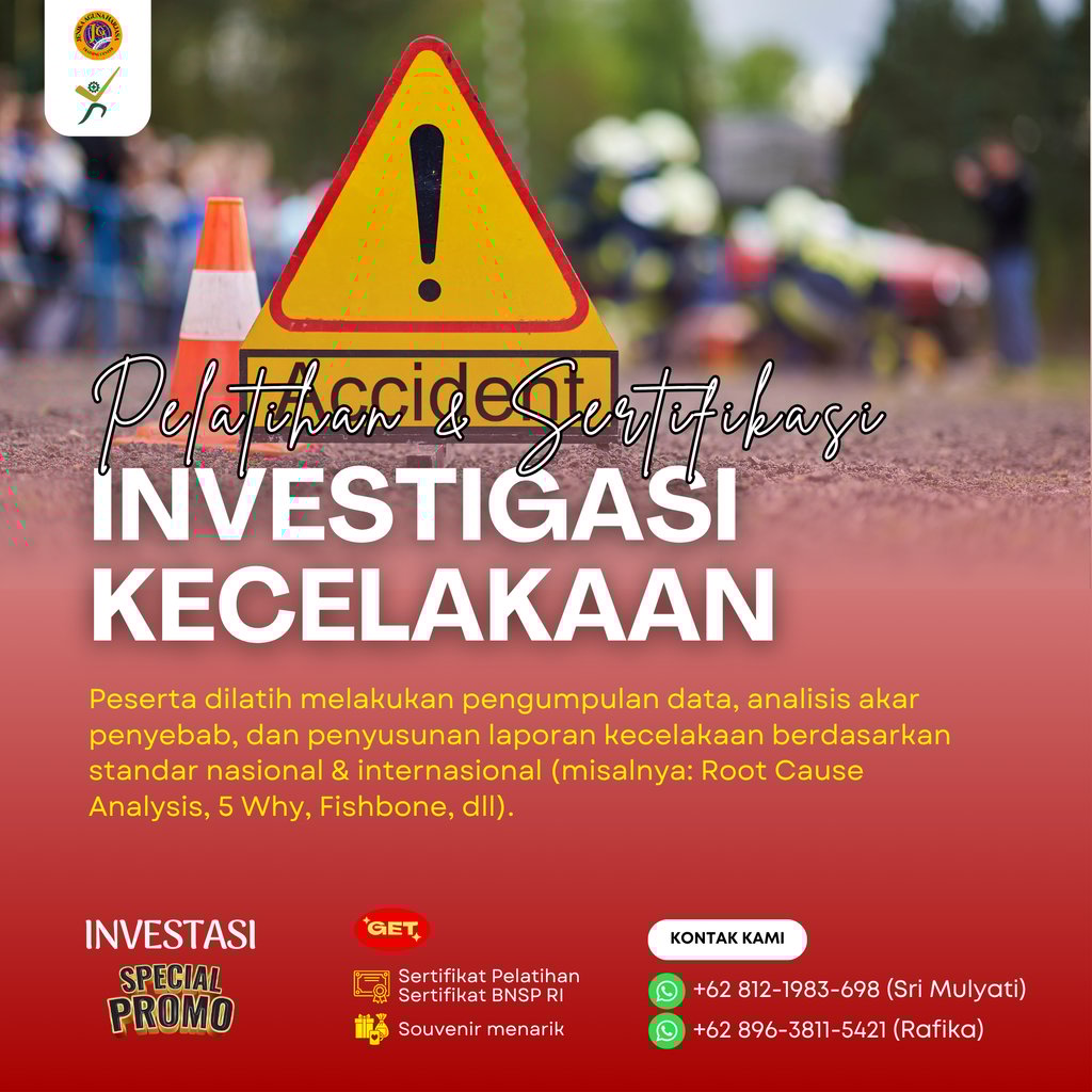 Pelatihan dan Sertifikasi Investigasi Kecelakaan adalah program pelatihan yang dirancang untuk membekali tenaga kerja dengan kompetensi dalam melakukan proses investigasi kecelakaan kerja secara sistematis, objektif, dan berbasis bukti, guna menemukan akar penyebab dan mencegah kejadian serupa di masa depan. Program ini juga memberikan sertifikasi dari Badan Nasional Sertifikasi Profesi (BNSP) sebagai bukti kompetensi peserta dalam skema Investigasi Kecelakaan.