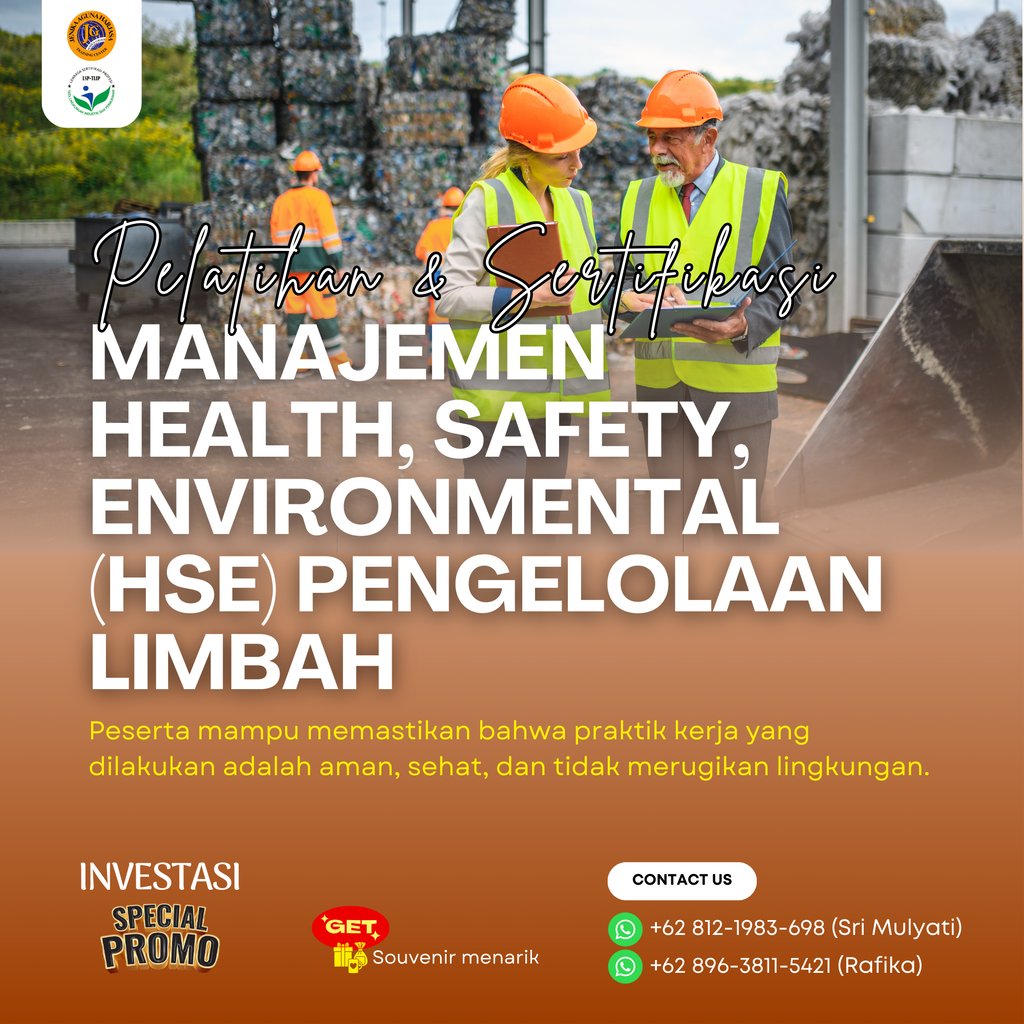 Pelatihan dan Sertifikasi Manajemen Health, Safety, Environmental (HSE) Pengelolaan Limbah adalah program pelatihan yang dirancang agar peserta mampu memastikan bahwa praktik kerja yang dilakukan adalah aman, sehat, dan tidak merugikan lingkungan. Program ini juga memberikan sertifikasi dari Badan Nasional Sertifikasi Profesi (BNSP) sebagai bukti kompetensi peserta dalam skema Manajemen Health, Safety, Environmental (HSE) Pengelolaan Limbah.