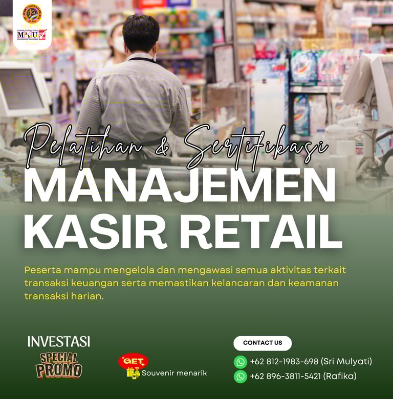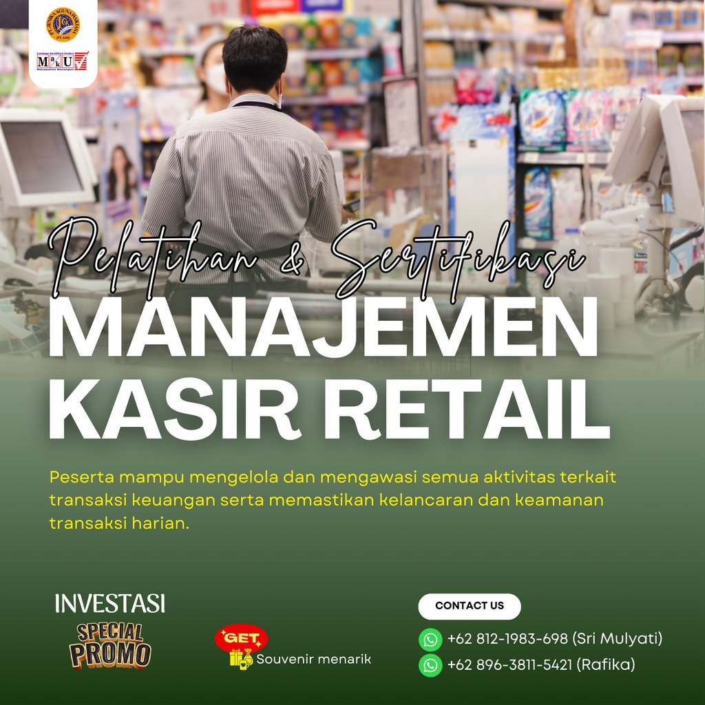Pelatihan dan Sertifikasi Manajemen Kasir Retail adalah program pelatihan yang dirancang agar peserta mampu mengelola dan mengawasi semua aktivitas terkait transaksi keuangan serta memastikan kelancaran dan keamanan transaksi harian. Program ini juga memberikan sertifikasi dari Badan Nasional Sertifikasi Profesi (BNSP) sebagai bukti kompetensi peserta dalam skema Manajemen Kasir Retail.