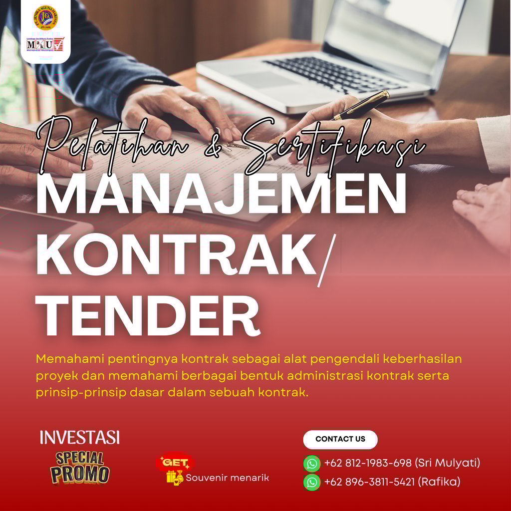 Pelatihan dan Sertifikasi Manajemen Kontrak/Tender adalah program pelatihan yang dirancang agar peserta mampu memahami pentingnya kontrak sebagai alat pengendali keberhasilan proyek dan memahami berbagai bentuk administrasi kontrak serta prinsip-prinsip dasar dalam sebuah kontrak. Program ini juga memberikan sertifikasi dari Badan Nasional Sertifikasi Profesi (BNSP) sebagai bukti kompetensi peserta dalam skema Manajemen Kontrak/Tender.