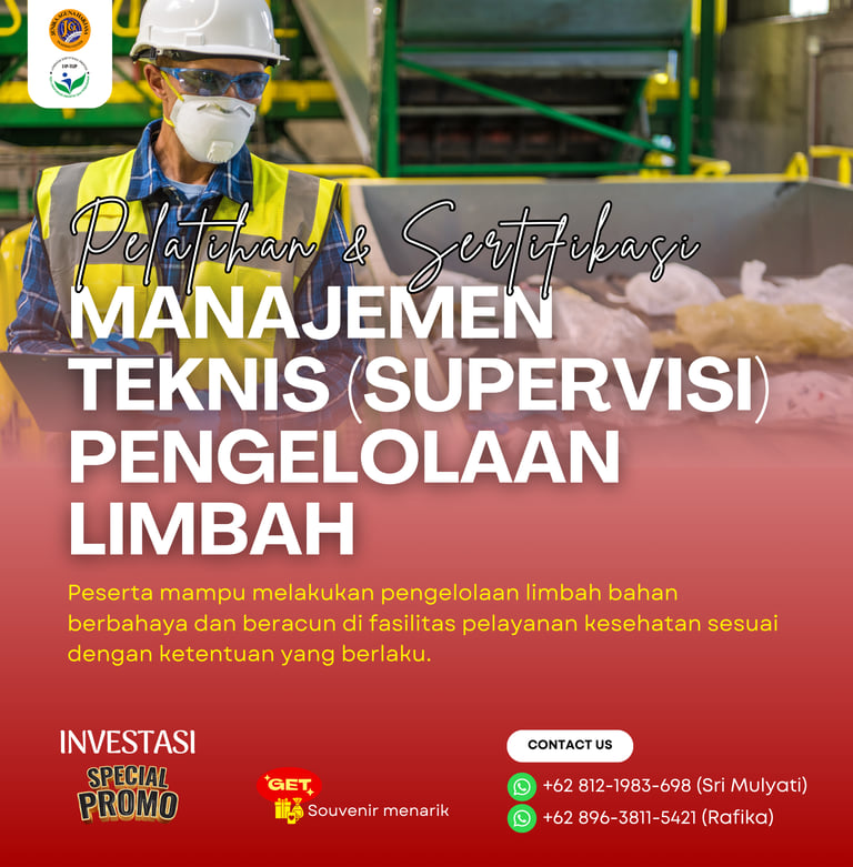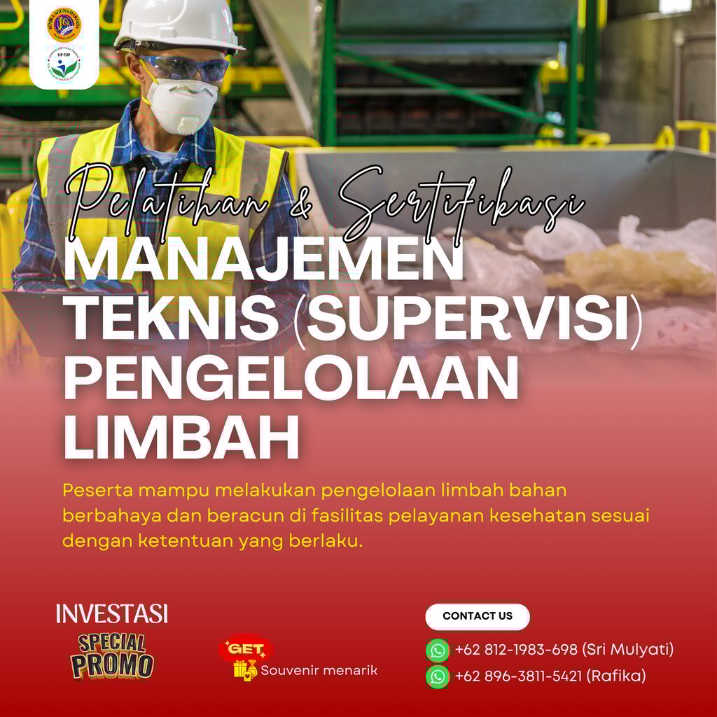 Pelatihan dan Sertifikasi Manajemen Teknis (Supervisi) Pengelolaan Limbah adalah program pelatihan yang dirancang agar peserta mampu melakukan pengelolaan limbah bahan berbahaya dan beracun di fasilitas pelayanan kesehatan sesuai dengan ketentuan yang berlaku. Program ini juga memberikan sertifikasi dari Badan Nasional Sertifikasi Profesi (BNSP) sebagai bukti kompetensi peserta dalam skema Manajemen Teknis (Supervisi) Pengelolaan Limbah.