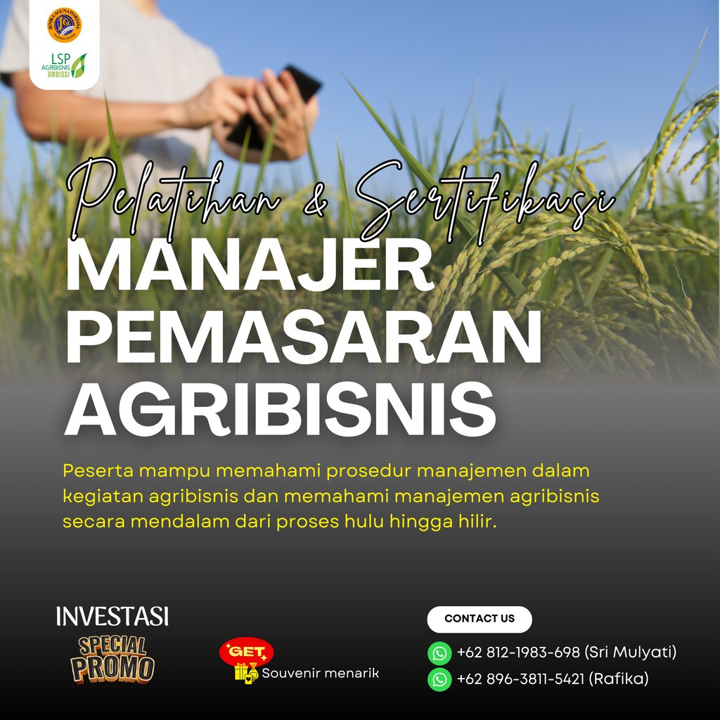 Pelatihan dan Sertifikasi Manajer Pemasaran Agribisnis adalah program pelatihan yang dirancang agar peserta mampu memahami prosedur manajemen dalam kegiatan agribisnis dan memahami manajemen agribisnis secara mendalam dari proses hulu hingga hilir. Program ini juga memberikan sertifikasi dari Badan Nasional Sertifikasi Profesi (BNSP) sebagai bukti kompetensi peserta dalam skema Manajer Pemasaran Agribisnis.