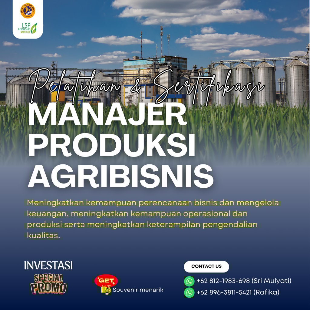 Pelatihan dan Sertifikasi Manajer Produksi Agribisnis adalah program pelatihan yang dirancang untuk meningkatkan kemampuan perencanaan bisnis dan mengelola keuangan, meningkatkan kemampuan operasional dan produksi serta meningkatkan keterampilan pengendalian kualitas. Program ini juga memberikan sertifikasi dari Badan Nasional Sertifikasi Profesi (BNSP) sebagai bukti kompetensi peserta dalam skema Manajer Produksi Agribisnis.