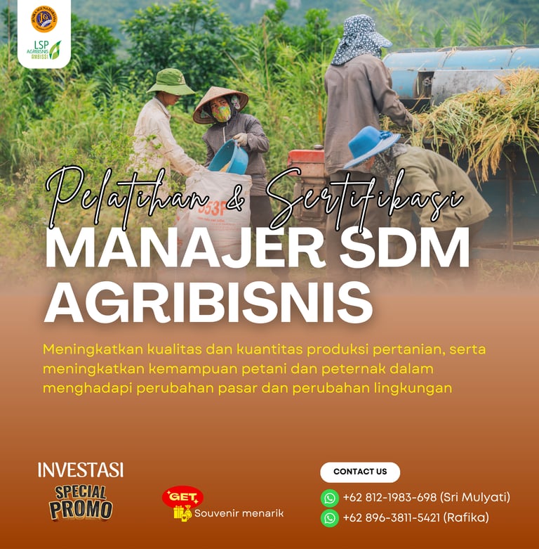 Pelatihan dan Sertifikasi Manajer SDM Agribisnis adalah program pelatihan yang dirancang untuk meningkatkan kualitas dan kuantitas produksi pertanian, serta meningkatkan kemampuan petani dan peternak dalam menghadapi perubahan pasar dan perubahan lingkungan. Program ini juga memberikan sertifikasi dari Badan Nasional Sertifikasi Profesi (BNSP) sebagai bukti kompetensi peserta dalam skema Manajer SDM Agribisnis.
