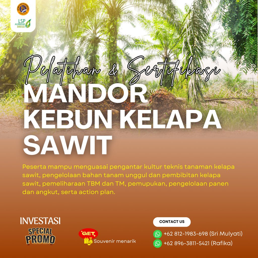 Pelatihan dan Sertifikasi Mandor Kebun Kelapa Sawit adalah program pelatihan yang dirancang agar peserta mampu menguasai pengantar kultur teknis tanaman kelapa sawit, pengelolaan bahan tanam unggul dan pembibitan kelapa sawit, pemeliharaan TBM dan TM, pemupukan, pengelolaan panen dan angkut, serta action plan. Program ini juga memberikan sertifikasi dari Badan Nasional Sertifikasi Profesi (BNSP) sebagai bukti kompetensi peserta dalam skema Mandor Kebun Kelapa Sawit.