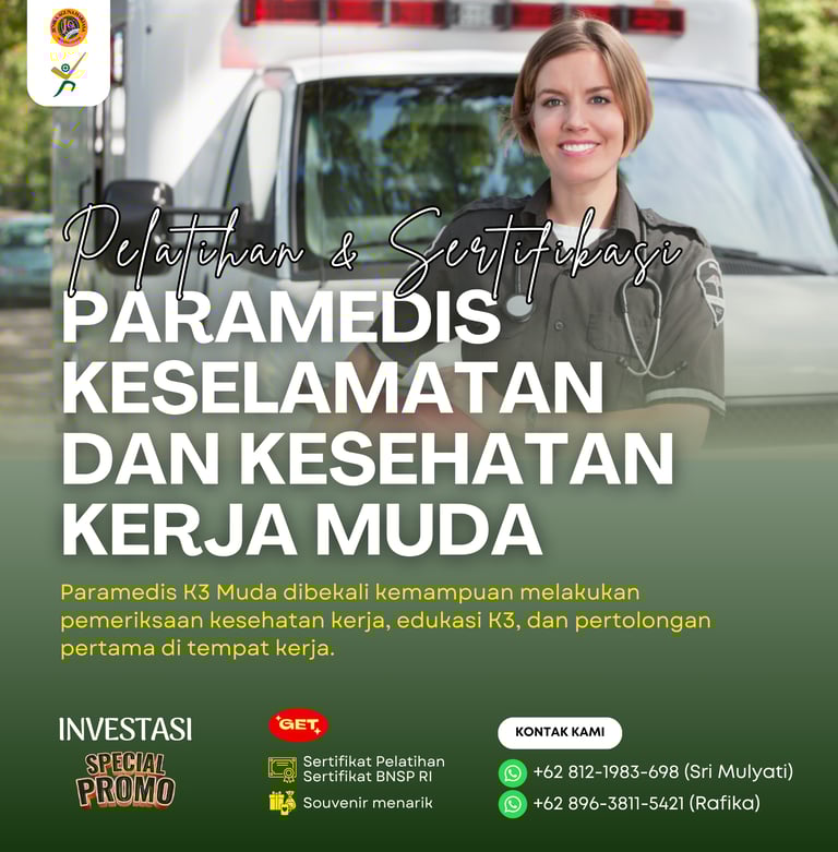 Pelatihan dan Sertifikasi Paramedis Keselamatan dan Kesehatan Kerja Muda adalah program pelatihan yang dirancang untuk membekali tenaga medis atau calon tenaga medis dengan kompetensi dasar dalam pelaksanaan tugas-tugas K3 di tempat kerja, khususnya dalam upaya promotif, preventif, kuratif, dan rehabilitatif terkait keselamatan dan kesehatan tenaga kerja. Program ini juga memberikan sertifikasi dari Badan Nasional Sertifikasi Profesi (BNSP) sebagai bukti kompetensi peserta dalam skema Paramedis Keselamatan dan Kesehatan Kerja Muda.