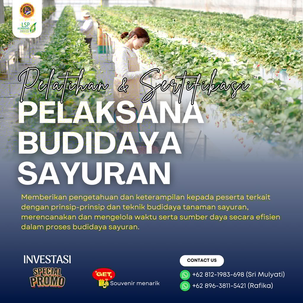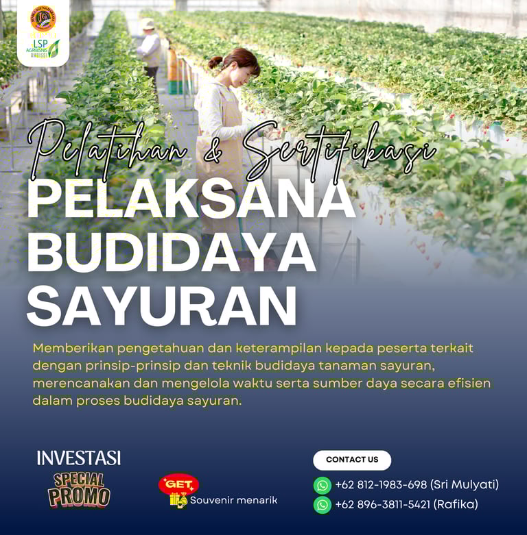 Pelatihan dan Sertifikasi Pelaksana Budidaya Sayuran adalah program pelatihan yang dirancang untuk memberikan pengetahuan dan keterampilan kepada peserta terkait dengan prinsip-prinsip dan teknik budidaya tanaman sayuran, merencanakan dan mengelola waktu serta sumber daya secara efisien dalam proses budidaya sayuran. Program ini juga memberikan sertifikasi dari Badan Nasional Sertifikasi Profesi (BNSP) sebagai bukti kompetensi peserta dalam skema Pelaksana Budidaya Sayuran.
