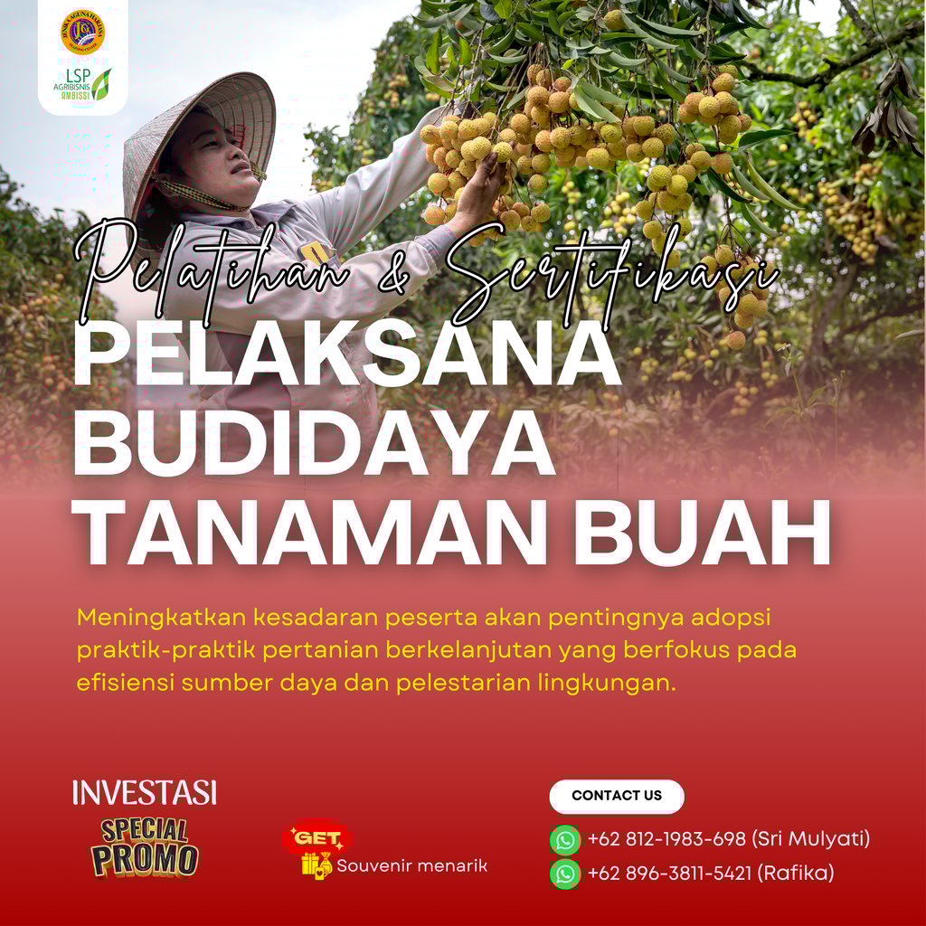 Pelatihan dan Sertifikasi Pelaksana Budidaya Tanaman Buah adalah program pelatihan yang dirancang untuk meningkatkan kesadaran peserta akan pentingnya adopsi praktik-praktik pertanian berkelanjutan yang berfokus pada efisiensi sumber daya dan pelestarian lingkungan. Program ini juga memberikan sertifikasi dari Badan Nasional Sertifikasi Profesi (BNSP) sebagai bukti kompetensi peserta dalam skema Pelaksana Budidaya Tanaman Buah.