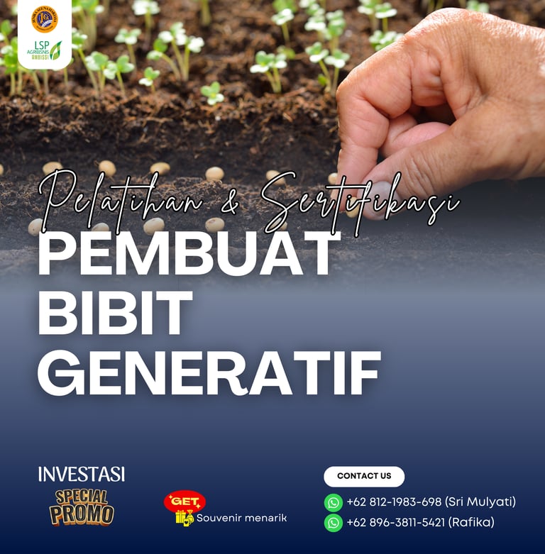 Pelatihan dan Sertifikasi Pembuat Bibit Generatif adalah program pelatihan yang dirancang untuk meningkatkan pengetahuan dan keterampilan peserta dalam menghasilkan bibit berkualitas tinggi. Program ini juga memberikan sertifikasi dari Badan Nasional Sertifikasi Profesi (BNSP) sebagai bukti kompetensi peserta dalam skema Pembuat Bibit Generatif.