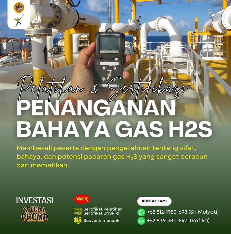 Pelatihan dan Sertifikasi Penanganan Bahaya Gas H2S adalah program pelatihan yang dirancang untuk membekali peserta dengan kompetensi dalam mengenali, mengantisipasi, dan menangani paparan gas H2S yang sangat berbahaya bagi keselamatan dan kesehatan kerja, khususnya di sektor migas, pertambangan, dan industri petrokimia. Program ini juga memberikan sertifikasi dari Badan Nasional Sertifikasi Profesi (BNSP) sebagai bukti kompetensi peserta dalam skema Penanganan Bahaya Gas H2S.