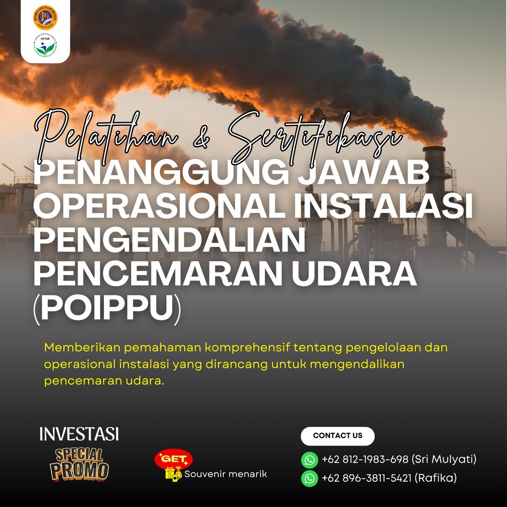 Pelatihan dan Sertifikasi Penanggung Jawab Operasional Instalasi Pengendalian Pencemaran Udara (POIPPU) adalah program pelatihan yang dirancang untuk memberikan pemahaman komprehensif tentang pengelolaan dan operasional instalasi yang dirancang untuk mengendalikan pencemaran udara.. Program ini juga memberikan sertifikasi dari Badan Nasional Sertifikasi Profesi (BNSP) sebagai bukti kompetensi peserta dalam skema Penanggung Jawab Operasional Instalasi Pengendalian Pencemaran Udara (POIPPU).