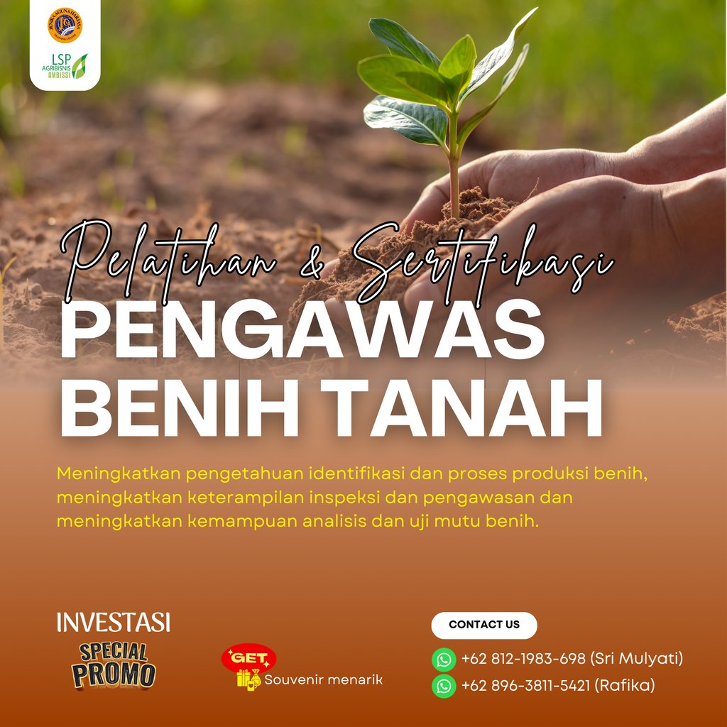 Pelatihan dan Sertifikasi Pengawas Benih Tanah adalah program pelatihan yang dirancang untuk meningkatkan pengetahuan identifikasi dan proses produksi benih, meningkatkan keterampilan inspeksi dan pengawasan dan meningkatkan kemampuan analisis dan uji mutu benih. Program ini juga memberikan sertifikasi dari Badan Nasional Sertifikasi Profesi (BNSP) sebagai bukti kompetensi peserta dalam skema Pengawas Benih Tanah.