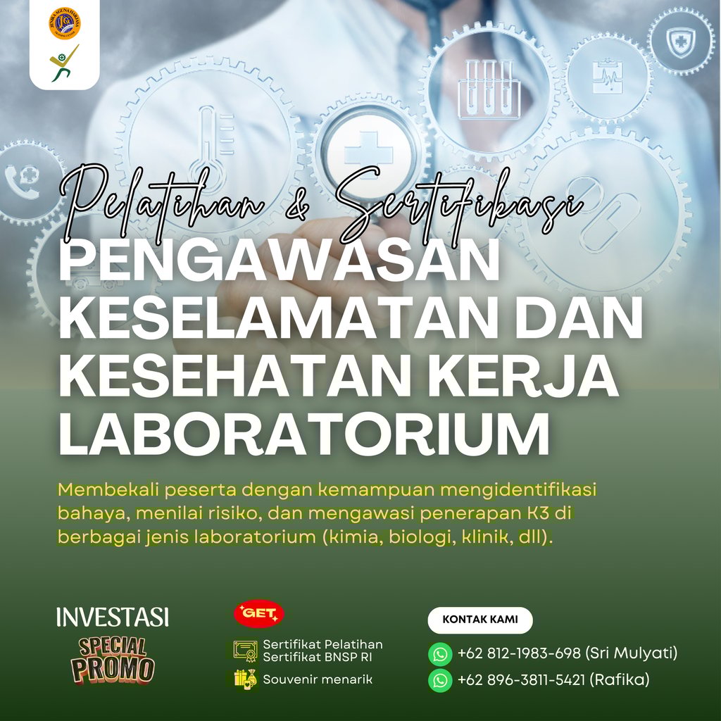 Pelatihan dan Sertifikasi Pengawasan Keselamatan dan Kesehatan Kerja Laboratorium adalah program pelatihan yang dirancang untuk membekali peserta dengan kompetensi dalam melakukan pengawasan pelaksanaan K3 di lingkungan laboratorium, yang memiliki potensi bahaya tinggi akibat penggunaan bahan kimia, biologi, fisik, dan peralatan khusus. Program ini juga memberikan sertifikasi dari Badan Nasional Sertifikasi Profesi (BNSP) sebagai bukti kompetensi peserta dalam skema Pengawasan Keselamatan dan Kesehatan Kerja Laboratorium.