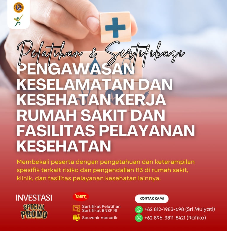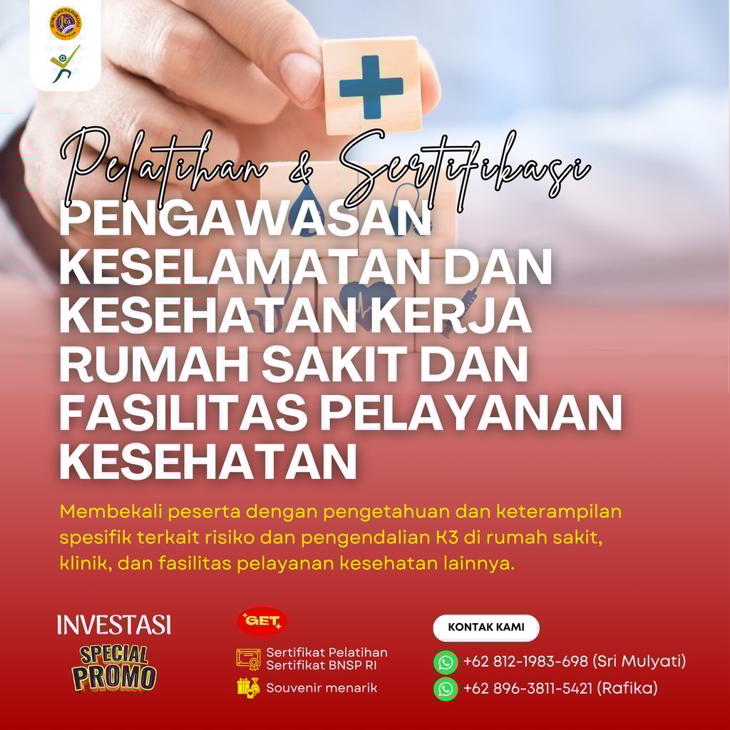 Pelatihan dan Sertifikasi Pengawasan Keselamatan dan Kesehatan Kerja Rumah Sakit dan Fasilitas Pelayanan Kesehatan adalah program pelatihan yang dirancang untuk membekali tenaga kerja dengan kompetensi dalam mengawasi pelaksanaan K3 secara khusus di rumah sakit dan fasilitas pelayanan kesehatan (fasyankes), yang memiliki karakteristik risiko kerja berbeda dari industri umum. Program ini juga memberikan sertifikasi dari Badan Nasional Sertifikasi Profesi (BNSP) sebagai bukti kompetensi peserta dalam skema Pengawasan Keselamatan dan Kesehatan Kerja Rumah Sakit dan Fasilitas Pelayanan Kesehatan.