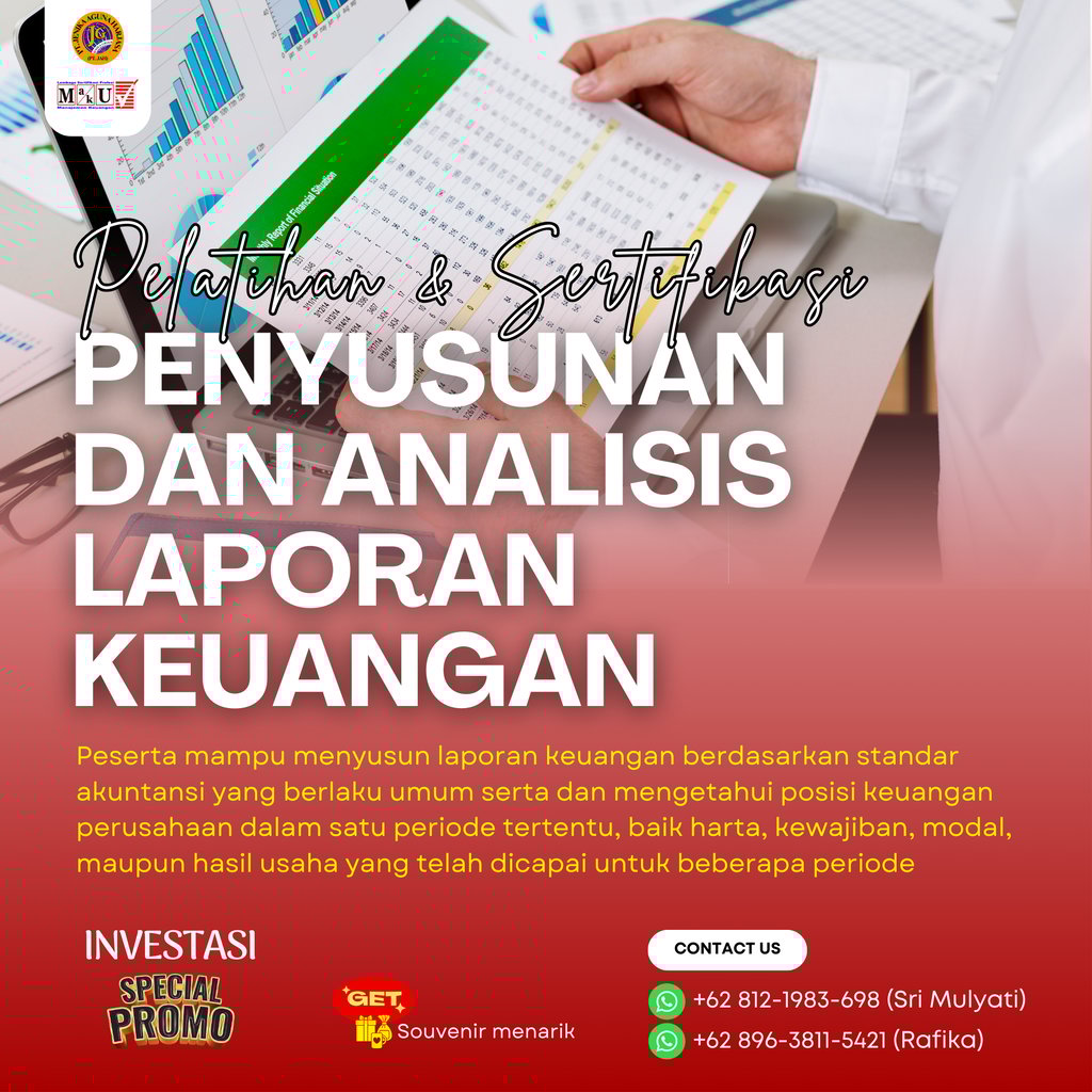 Pelatihan dan Sertifikasi Penyusunan dan Analisis Laporan Keuangan adalah program pelatihan yang dirancang agar peserta mampu menyusun laporan keuangan berdasarkan standar akuntansi yang berlaku umum serta dan mengetahui posisi keuangan perusahaan dalam satu periode tertentu, baik harta, kewajiban, modal, maupun hasil usaha yang telah dicapai untuk beberapa periode. Program ini juga memberikan sertifikasi dari Badan Nasional Sertifikasi Profesi (BNSP) sebagai bukti kompetensi peserta dalam skema Penyusunan dan Analisis Laporan Keuangan.