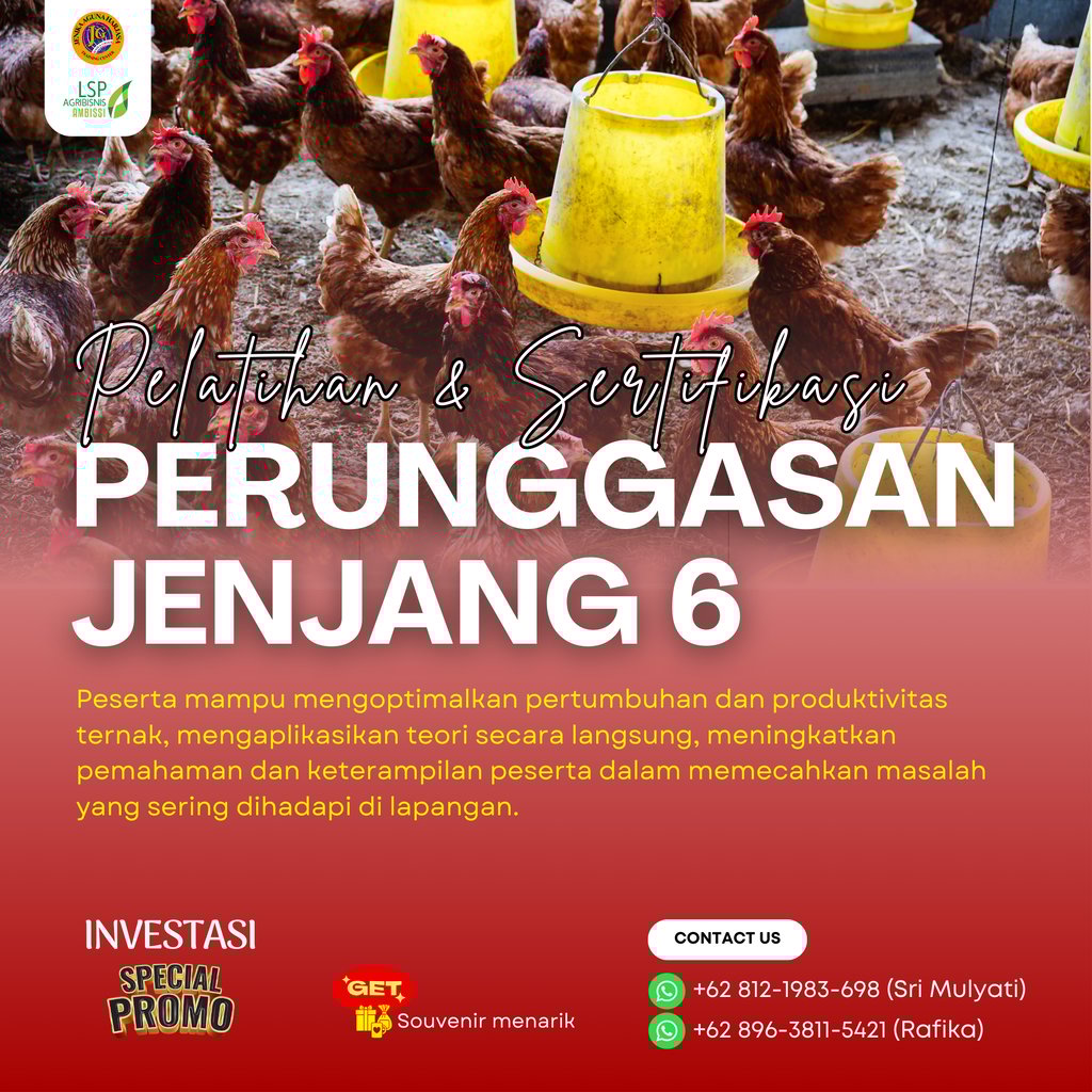 Pelatihan dan Sertifikasi Perunggasan Jenjang 6 adalah program pelatihan yang dirancang agar peserta mampu mengoptimalkan pertumbuhan dan produktivitas ternak, mengaplikasikan teori secara langsung, meningkatkan pemahaman dan keterampilan peserta dalam memecahkan masalah yang sering dihadapi di lapangan. Program ini juga memberikan sertifikasi dari Badan Nasional Sertifikasi Profesi (BNSP) sebagai bukti kompetensi peserta dalam skema Perunggasan Jenjang 6.