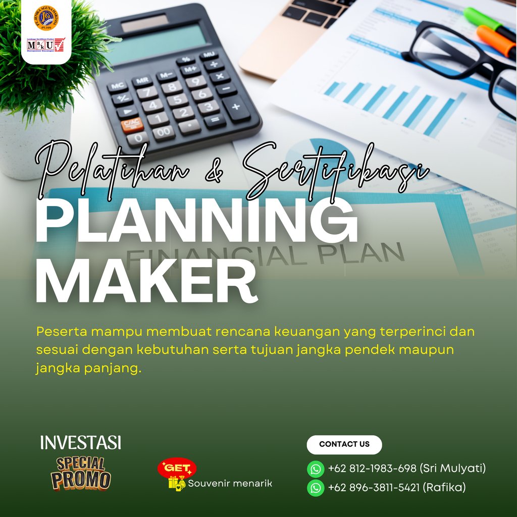 Pelatihan dan Sertifikasi Planning Maker adalah program pelatihan yang dirancang agar peserta mampu membuat rencana keuangan yang terperinci dan sesuai dengan kebutuhan serta tujuan jangka pendek maupun jangka panjang. Program ini juga memberikan sertifikasi dari Badan Nasional Sertifikasi Profesi (BNSP) sebagai bukti kompetensi peserta dalam skema Planning Maker.