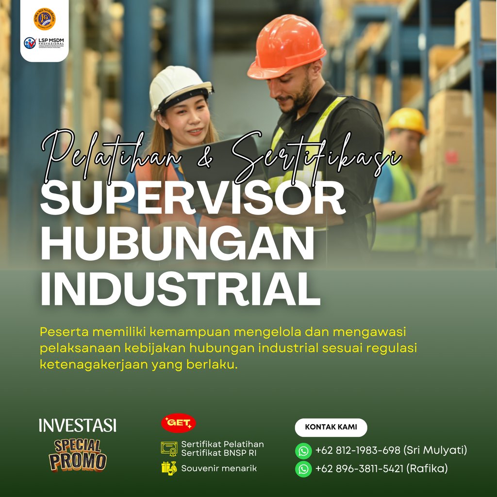 Pelatihan dan Sertifikasi Supervisor Hubungan Industrial adalah program pelatihan yang dirancang untuk membekali peserta dengan kompetensi profesional dalam mengelola hubungan antara perusahaan dan pekerja, menjaga kepatuhan terhadap hukum ketenagakerjaan, serta menciptakan hubungan kerja yang harmonis, adil, dan produktif. Program ini juga memberikan sertifikasi dari Badan Nasional Sertifikasi Profesi (BNSP) sebagai bukti kompetensi peserta dalam skema Supervisor Hubungan Industrial.