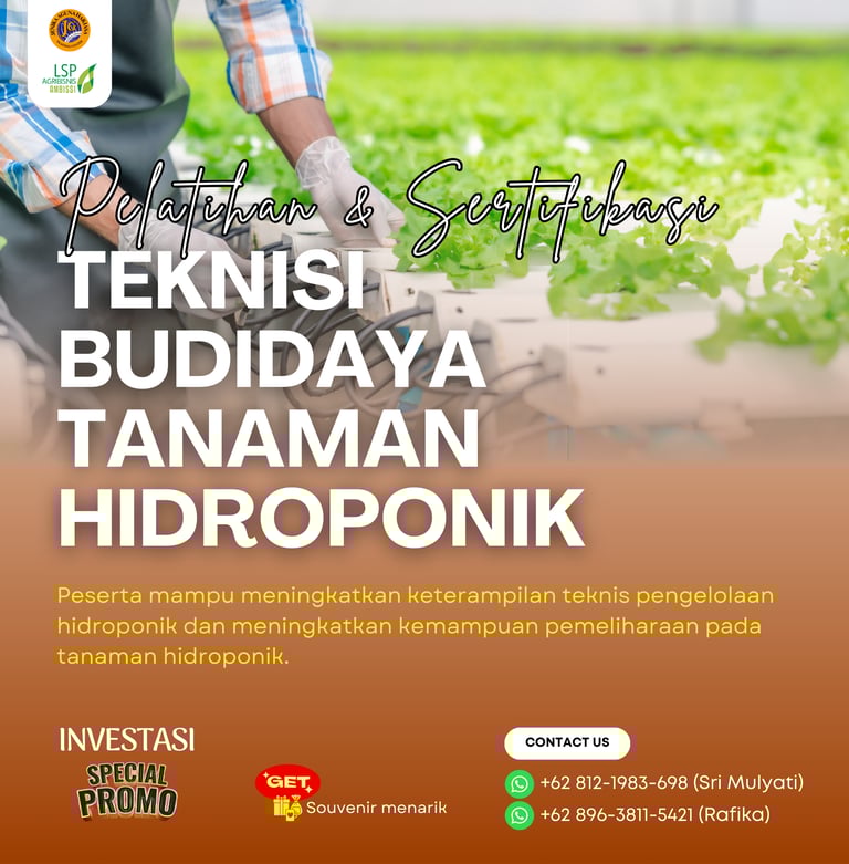 Pelatihan dan Sertifikasi Teknisi Budidaya Tanaman Hidroponik adalah program pelatihan yang dirancang agar peserta mampu meningkatkan keterampilan teknis pengelolaan hidroponik dan meningkatkan kemampuan pemeliharaan pada tanaman hidroponik. Program ini juga memberikan sertifikasi dari Badan Nasional Sertifikasi Profesi (BNSP) sebagai bukti kompetensi peserta dalam skema Teknisi Budidaya Tanaman Hidroponik.