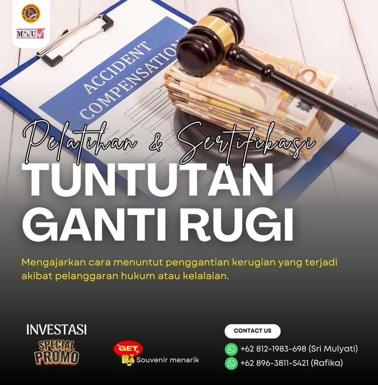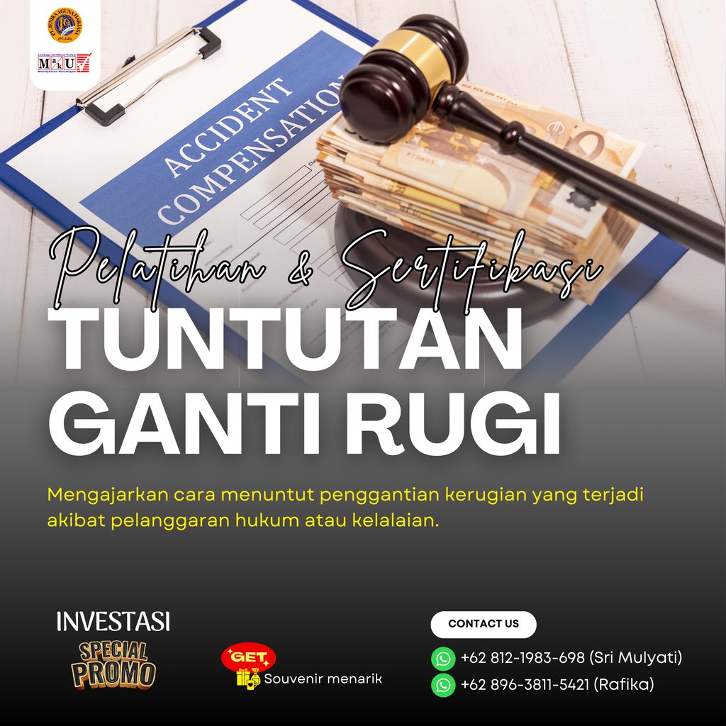 Pelatihan dan Sertifikasi Tuntutan Ganti Rugi adalah program pelatihan yang dirancang untuk mengajarkan cara menuntut penggantian kerugian yang terjadi akibat pelanggaran hukum atau kelalaian. Program ini juga memberikan sertifikasi dari Badan Nasional Sertifikasi Profesi (BNSP) sebagai bukti kompetensi peserta dalam skema Tuntutan Ganti Rugi.