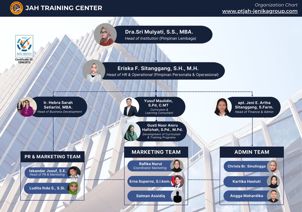 Kami, JENIKA AGUNA HARJASA (JAH) TRAINING CENTER, berdiri sejak 18 Desember 2024 merupakan badan usaha yang berafiliasi dengan badan usaha CV JENIKA GROUP (Holding Company) yang bergerak dibidang Jasa Penerjemahan, Interpreting & Pelatihan Bahasa secara online dan offline yang berdiri sejak 22 Juli 2003. JAH Training Center didirikan sebagai upaya untuk lebih fokus dalam pengembangan usaha dibidang pelatihan profesi dan berkolaborasi dengan LPK dan LSP yang berlisensi resmi BNSP. Tertanggal 02 Juli 2024 CV JENIKA GROUP diberikan mandat oleh LSP ABP Modern sebagai TUK 11 skema dan LSP IKN sebagai TUK (Tempat Uji Kompetensi) Training of Trainer (TOT) dan membuka peluang berkolaborasi dengan LPK berlisensi Disnaker & LSP lainnya yang berlisensi BNSP berlokasi di wilayah Republik Indonesia.