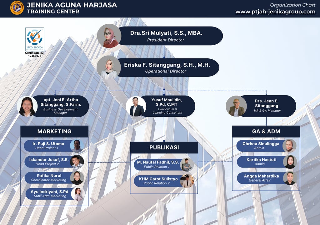 Kami, PT. JENIKA AGUNA HARJASA (JAH TRAINING CENTER), berdiri sejak 18 Desember 2024 merupakan badan usaha yang berafiliasi dengan badan usaha CV JENIKA GROUP (Holding Company) yang bergerak dibidang Jasa Penerjemahan, Interpreting & Pelatihan Bahasa secara online dan offline yang berdiri sejak 22 Juli 2003. JAH Training Center didirikan sebagai upaya untuk lebih fokus dalam pengembangan usaha dibidang pelatihan profesi dan berkolaborasi dengan LPK dan LSP yang berlisensi resmi BNSP. Tertanggal 02 Juli 2024 CV JENIKA GROUP diberikan mandat oleh LSP ABP Modern sebagai TUK 11 skema dan LSP IKN sebagai TUK (Tempat Uji Kompetensi) Training of Trainer (TOT) dan membuka peluang berkolaborasi dengan LPK berlisensi Disnaker & LSP lainnya yang berlisensi BNSP berlokasi di wilayah Republik Indonesia.