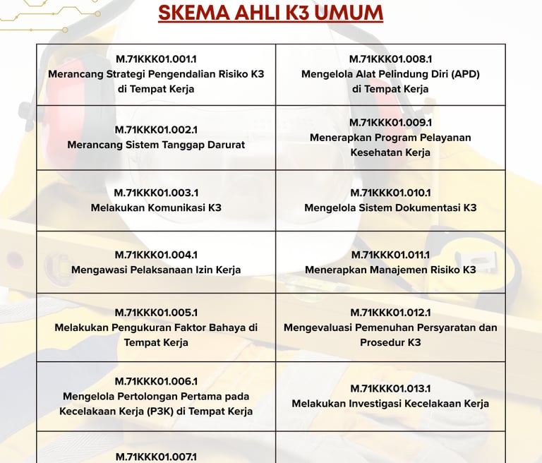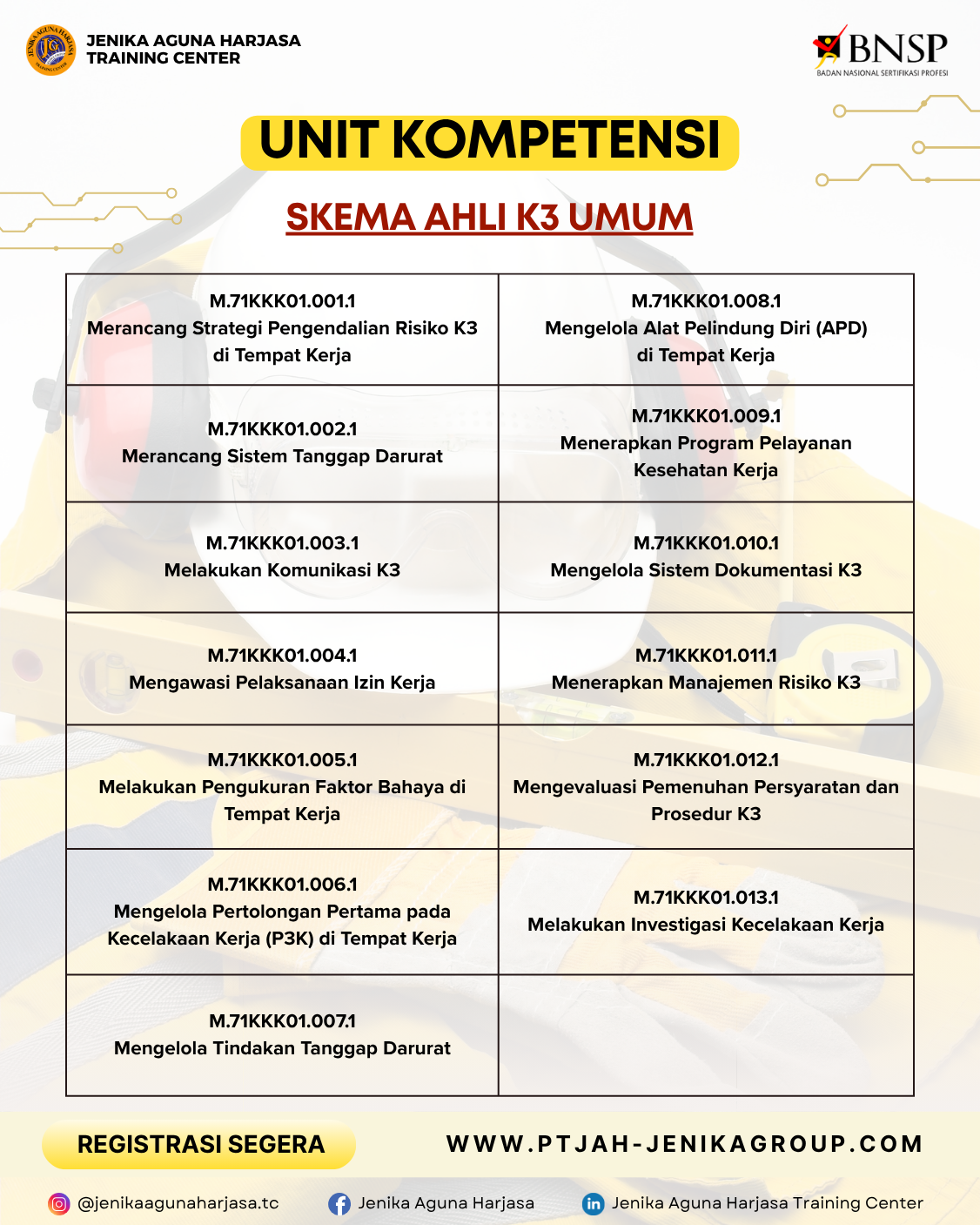 ✨ Tingkatkan kompetensi Anda di bidang Keselamatan & Kesehatan Kerja (K3) dengan mengikuti Pelatihan & Sertifikasi BNSP RI Skema Ahli K3 Umum.
