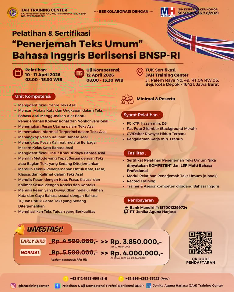 📚✨ Ikuti Pelatihan & Sertifikasi Profesi skema Penerjemah Teks Umum - Bahasa Inggris berlisensi resmi dari BNSP RI.