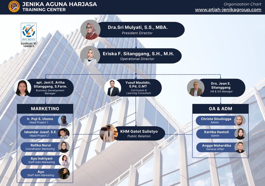 Kami, PT. JENIKA AGUNA HARJASA (PT. JAH), berdiri sejak 18 Desember 2024 merupakan badan usaha yang berafiliasi dengan badan usaha CV JENIKA GROUP (Holding Company) yang bergerak dibidang Jasa Penerjemahan, Interpreting & Pelatihan Bahasa secara online dan offline yang berdiri sejak 22 Juli 2003. PT. JAH didirikan sebagai upaya untuk lebih fokus dalam pengembangan usaha dibidang pelatihan profesi dan berkolaborasi dengan LPK dan LSP yang berlisensi resmi BNSP. Tertanggal 02 Juli 2024 CV JENIKA GROUP diberikan mandat oleh LSP ABP Modern sebagai TUK 11 skema dan LSP IKN sebagai TUK (Tempat Uji Kompetensi) Training of Trainer (TOT) dan membuka peluang berkolaborasi dengan LPK berlisensi Disnaker & LSP lainnya yang berlisensi BNSP berlokasi di wilayah Republik Indonesia.