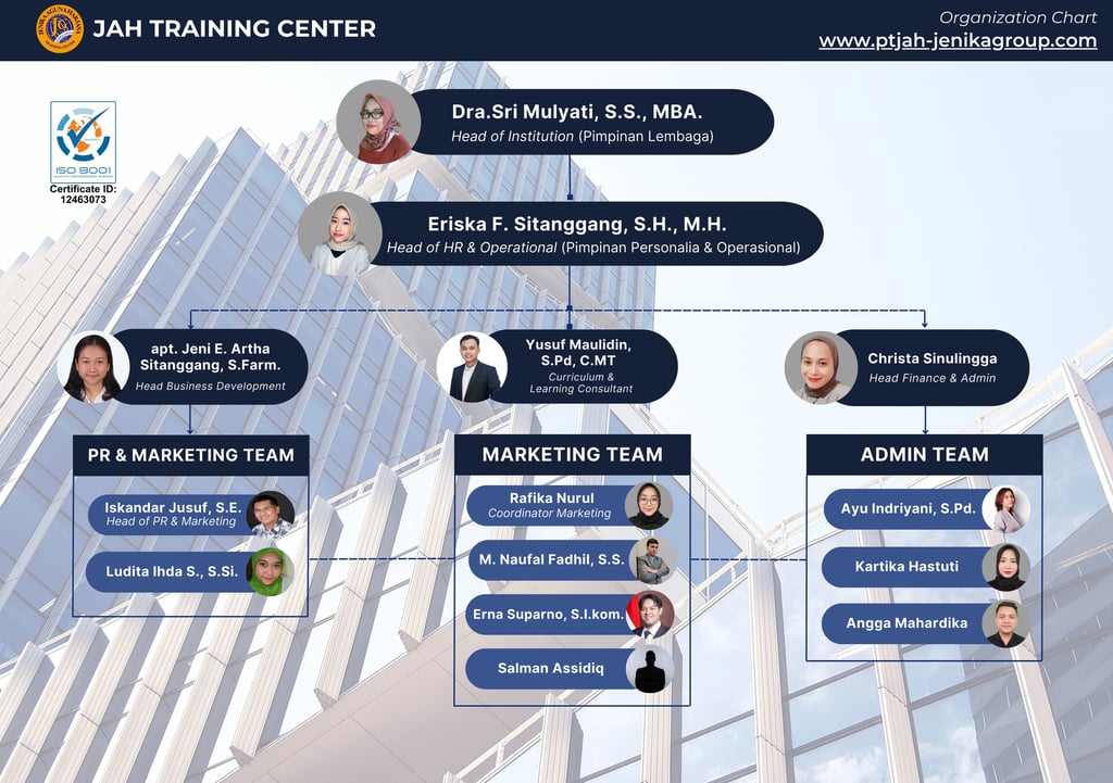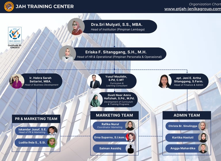 Kami, JENIKA AGUNA HARJASA (JAH) TRAINING CENTER, berdiri sejak 18 Desember 2024 merupakan badan usaha yang berafiliasi dengan badan usaha CV JENIKA GROUP (Holding Company) yang bergerak dibidang Jasa Penerjemahan, Interpreting & Pelatihan Bahasa secara online dan offline yang berdiri sejak 22 Juli 2003. JAH Training Center didirikan sebagai upaya untuk lebih fokus dalam pengembangan usaha dibidang pelatihan profesi dan berkolaborasi dengan LPK dan LSP yang berlisensi resmi BNSP. Tertanggal 02 Juli 2024 CV JENIKA GROUP diberikan mandat oleh LSP ABP Modern sebagai TUK 11 skema dan LSP IKN sebagai TUK (Tempat Uji Kompetensi) Training of Trainer (TOT) dan membuka peluang berkolaborasi dengan LPK berlisensi Disnaker & LSP lainnya yang berlisensi BNSP berlokasi di wilayah Republik Indonesia.